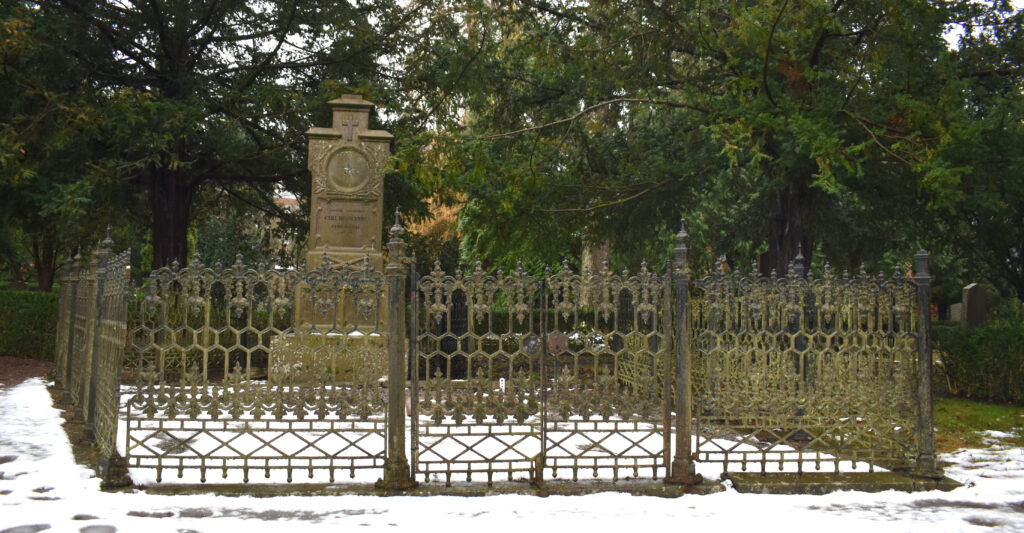Räcket kring Bernlunds grav på Norra Kyrkogården. Det har en idag något svårläst platta med texten C Bernlund Gjuteri Lund 1894. Räcket hade alltså ett antal år på nacken när Bernlund dog 1911. Idag är det i stort behov av en renovering. Foto 2024 och 2021.