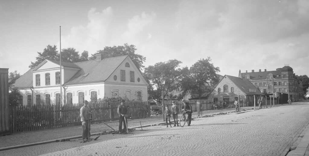 Till Spoletorpsegendomen hörde en bondgård. Det påkostade boningshuset från 1858 såldes 1880 till professor Seved Ribbing. Huset ligger kvar bakom det hus vars uppförande arbetarna på bilden håller på att förbereda. I en av de tidigare ekonomibyggnaderna vid Spolegatan lät Bernlund inrätta till sommarbostad åt sig själv – mindre än 500 meter från hans bostad vid Bangatan. Ursprungligen innehöll huset tre kammare, vagnsport, brygghus och hönshus. Bakom träden skymtar den villa som Bernlund lät uppföra 1897. Foto Per Bagge 1925, Lunds universitetsbibliotek.