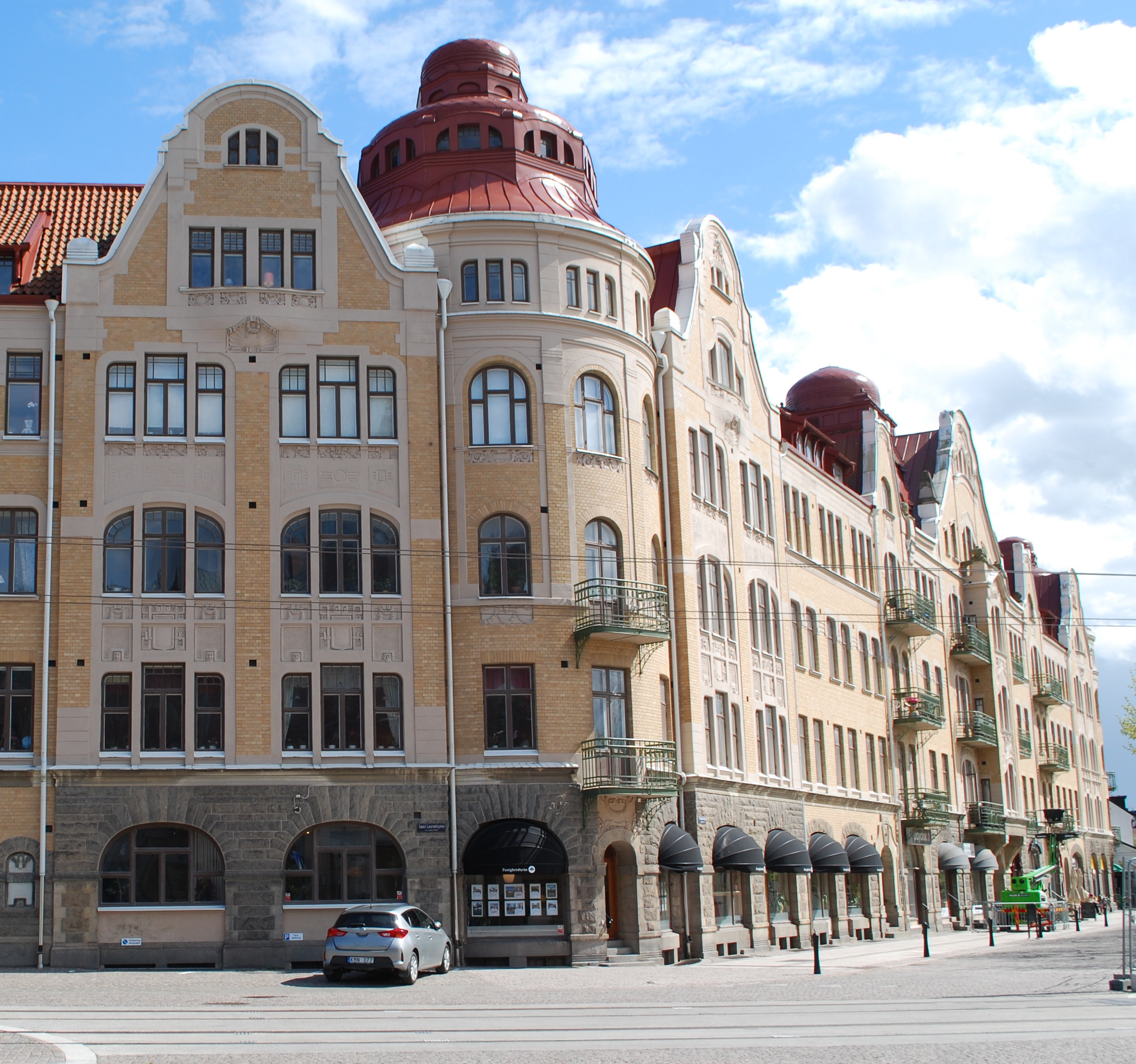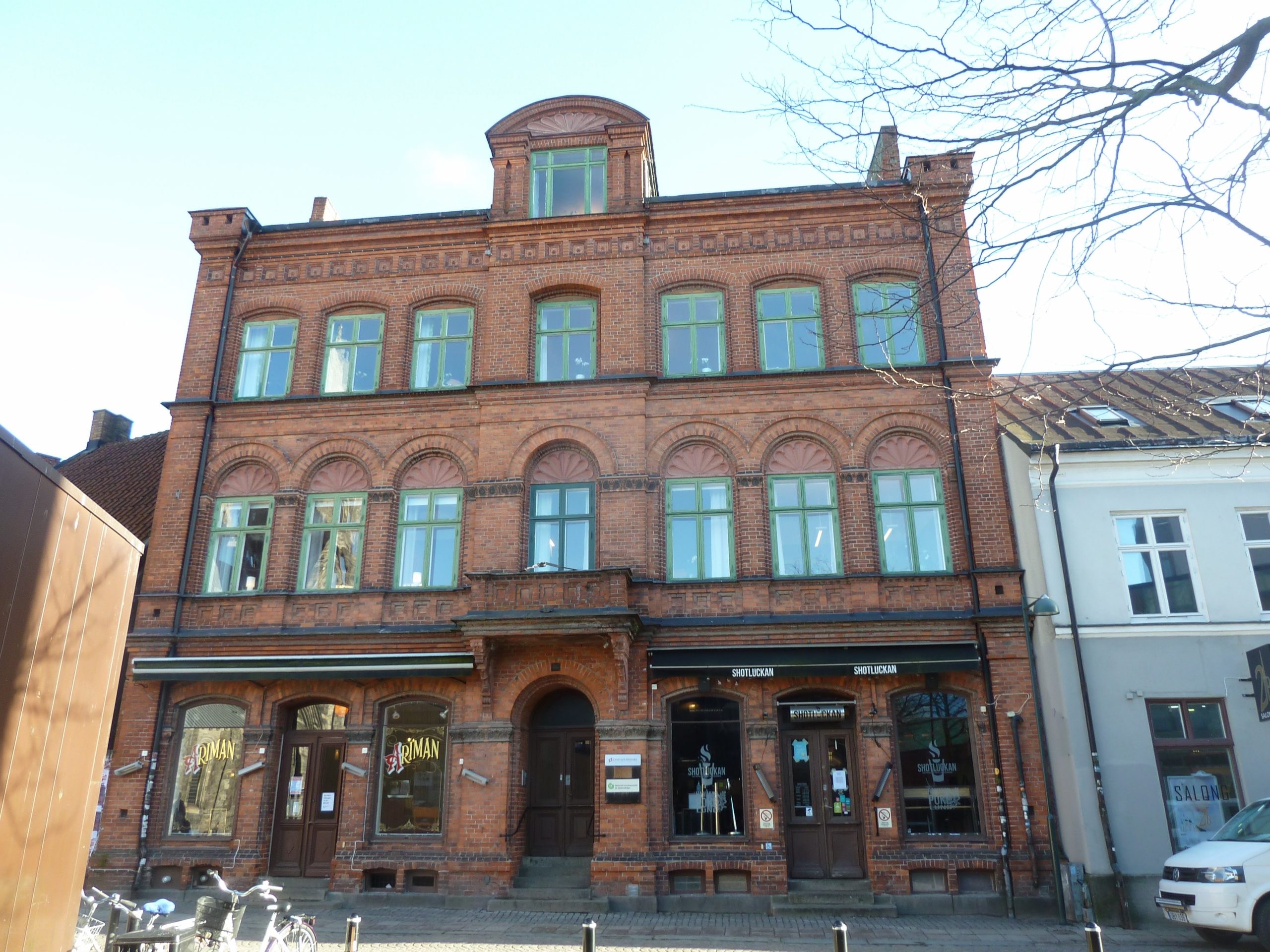 Vid Bantorget på Stora Fiskaregatan 15 ligger en byggnad från 1903 som med sina ljusa putsfasader, mjukt former, asymmetriska uppbyggnad och fantasifulla taklandskap utgör Lunds mest utpräglade jugendbyggnad. Egendomliga fabeldjur sticker fram sina nosar, ett bi kryper vid porten och där finns dansande grodor och en leende sol.