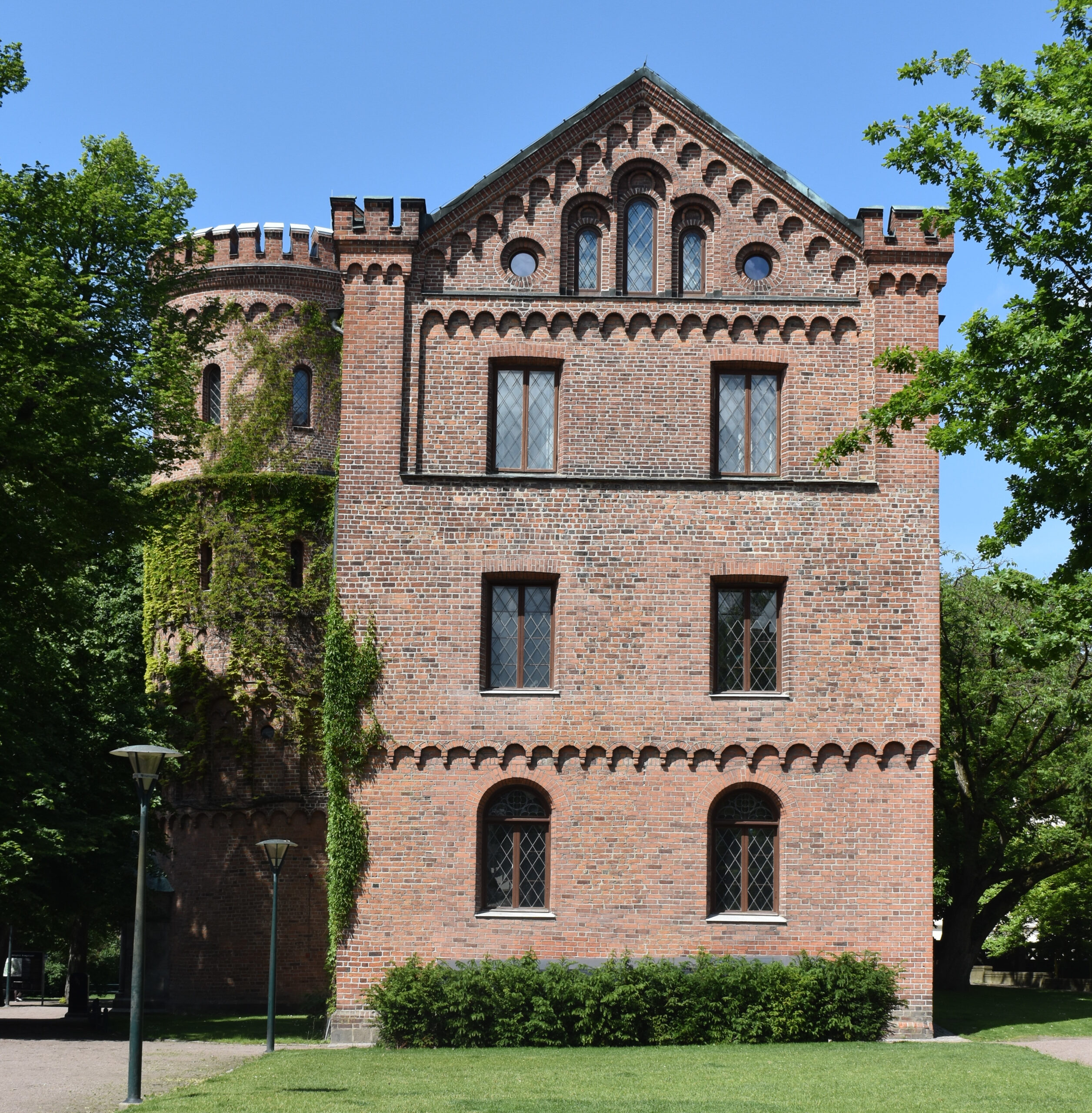 Trevåningsbyggnad i röd tegel med sadeltak. Sockeln i haillasten är hämtad från Allhelgonaklostrets ruiner och väggarnas tegel kommer dels från ett tegelbruk vid Trolleholm, vilket var anlagt av Brunius, och dels från Bohuslän. Fasaden mot Krafts torg är symmetrisk. Dess centralt placerade portal har kopplade sandstenskolonner med bysantinska kapital, huggna av murmästaren Johan Stenberg. Portalens […]