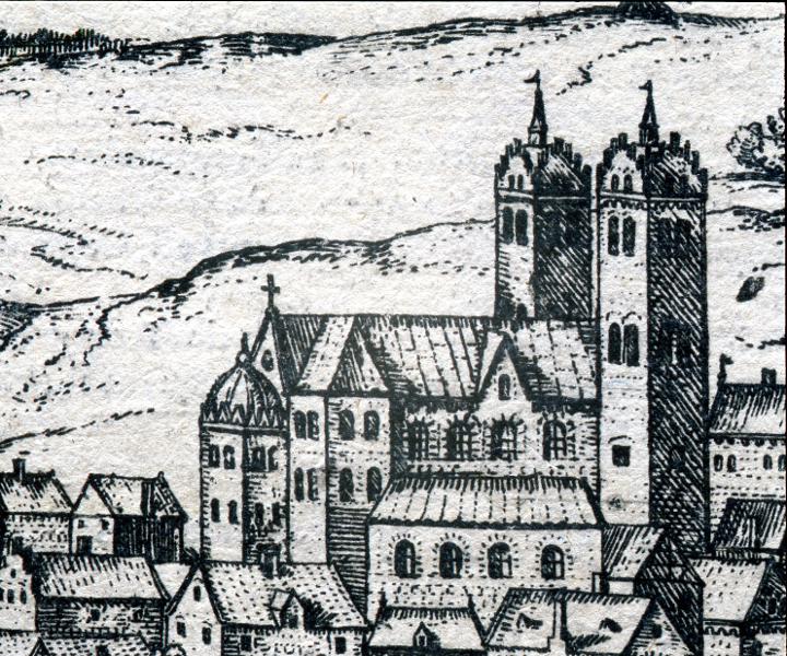 Den äldsta avbildningen som säkert visar domkyrkan finns på Frans Hogenbergs vy över Lund från 1588. Där avslutas tornen med trappstegsgavlar åt alla fyra hållen. Den utformningen fick tornen under Adam van Dürens renovering av domkyrkan 1506 -1527 då tornen även förhöjdes. Förmodligen skedde det i samband med att domkyrkans gamla storklocka Maria Laura, som vägde över nio ton, gjöts om, vilket ska ha skett strax före 1518.