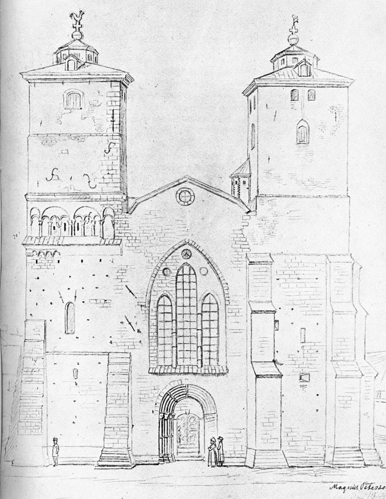 På ett kopparstick efter en teckning av akademiritmästaren Alexander Kastman 1755 syns klockstapeln tydligt. Det framgår också att det södra tornet var något lägre. Det ser också ut att finns en gångbro mellan de bägge tornen, men någon sådan syns inte på någon annan avbildning.