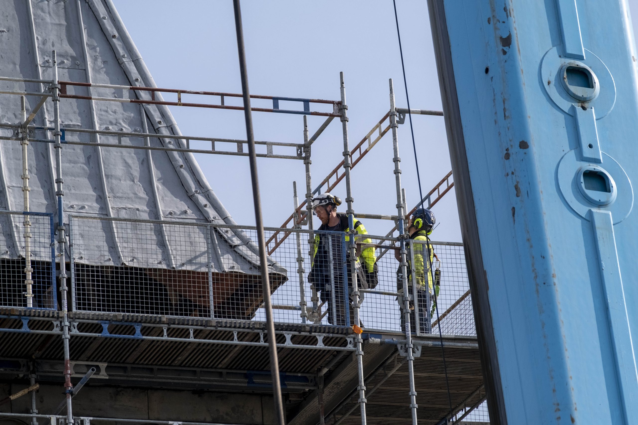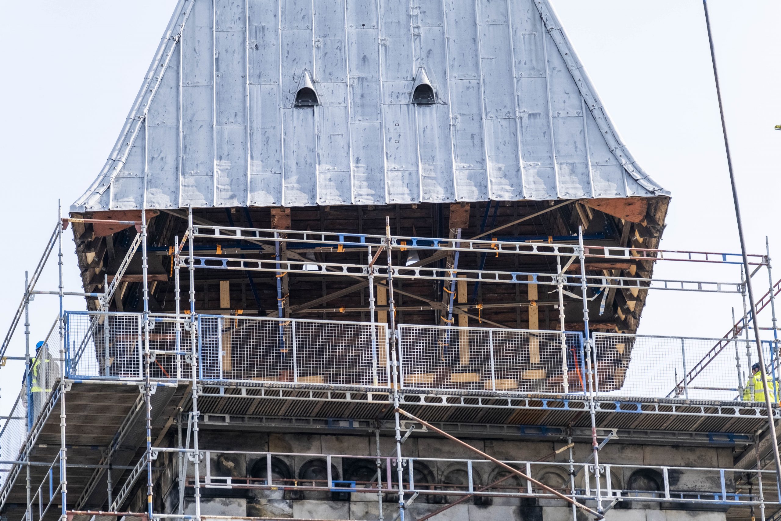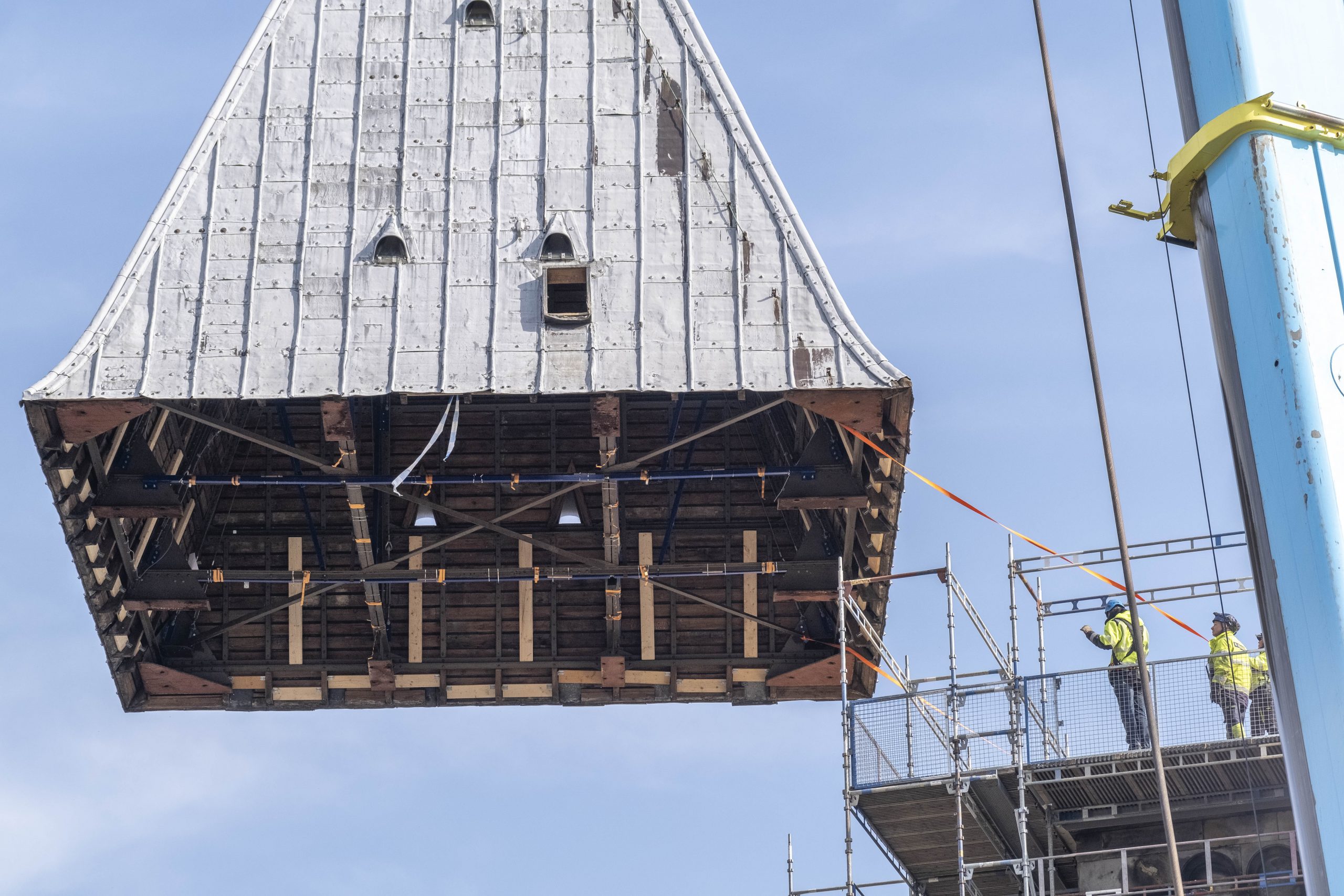 Varje torntak förstärktes rejält innan det kunde lyftas ner. Ett taks konstruktion ska normalt stå emot dragkrafter när det sitter på plats, men lyftet krävde att man förstärkte det så att det inte skulle riskera att fälla ihop sig som ett paraply. Ett stort jobb har gjorts för att klara detta och varje tak har förstärkts med flera balkar, 40 vajrar och ett stort antal spännband. För att få in torntaken i det tillfälliga tältet placeras de på en balkram som sedan skjuts (lanseras) med hjälp av domkrafter på plats längs två stålbalkar.
