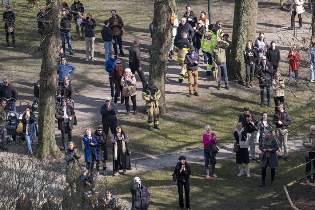 Första taket lättade kl 13.13 och jubel och applåder hördes i den ganska stora publik som samlats för att se på spektaklet.