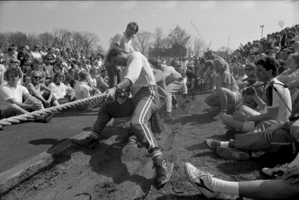 Under 50- och 60-talen var dragkampen en sport som togs på allvar bland Lunds nationer. Smålands nation lär ha planerat in en dragkampsbana när man byggde sina nuvarande nationshus på Kastanjegatan och Lunds nation hyrde en träningsplats i ett av stadsträdgårdsmästarens växthus! Låppan Hagander lär till och med ha konstruerat en dragkampsmaskin för Lunds nations tränings skull. Upphovsmannen till dragkamperna lär vara Aron Borelius som startade 1928. Långt in på 90-talet fortsatte dragkamperna som en del av sisteaprillekarna på Centrala idrottsplatsen, men då med lite mer öl och mindre blodigt allvar. Bilden är från siste april 1984.
