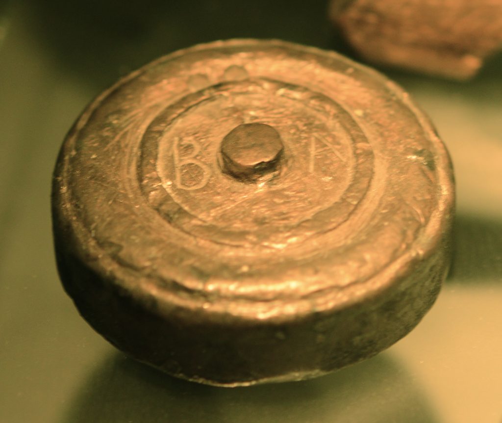Vikten är av koppar och har en diameter på 59 mm. Den timrade brunnen hade byggts efter 1536 och brukats in på 1600-talet.