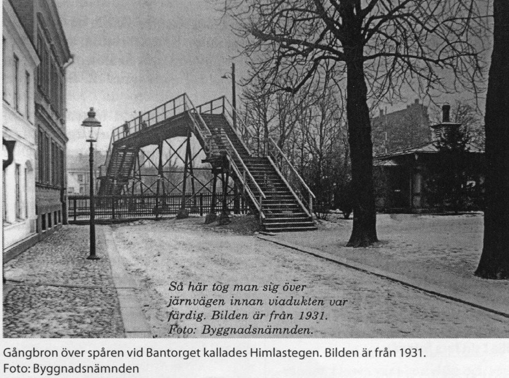 Att snedda över järnvägen för att komma till Lunds Västra, var förbjudet och därför mer spännande. Den tillåtna vägen gick utmed Spolegatan, förbi Centralstationen till Bantorget. På den tiden fanns det ingen undergång under järnvägen utan det var bommar och en gångbro som kallades Himlastegen. Eftersom bommarna ofta var fällda hade man rest en smäcker stålkonstruktion som en triumfbåge över spåren. Hade man riktig tur på gångbron passerade ett tåg så att vi blev insvepta i ånga och sot från loket.
