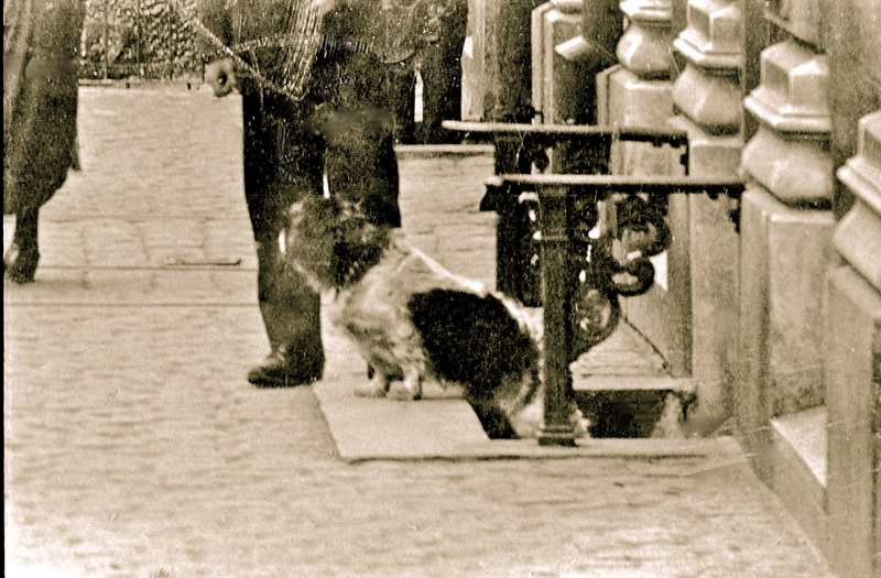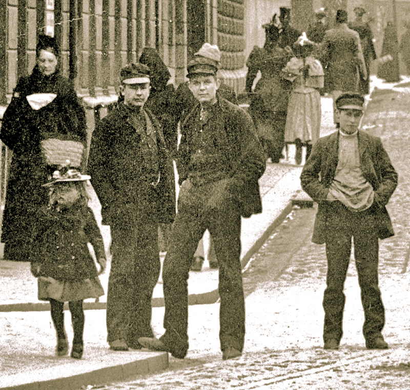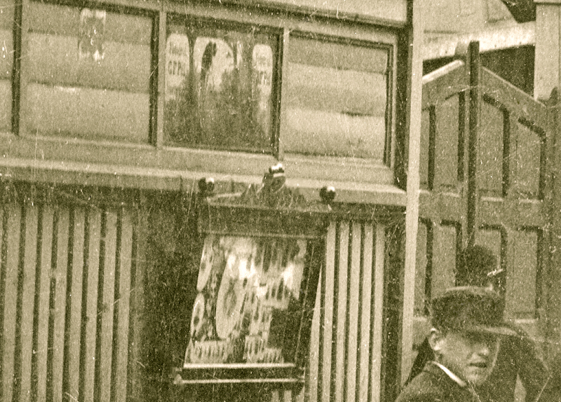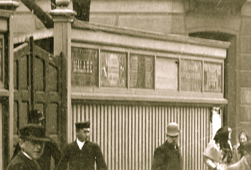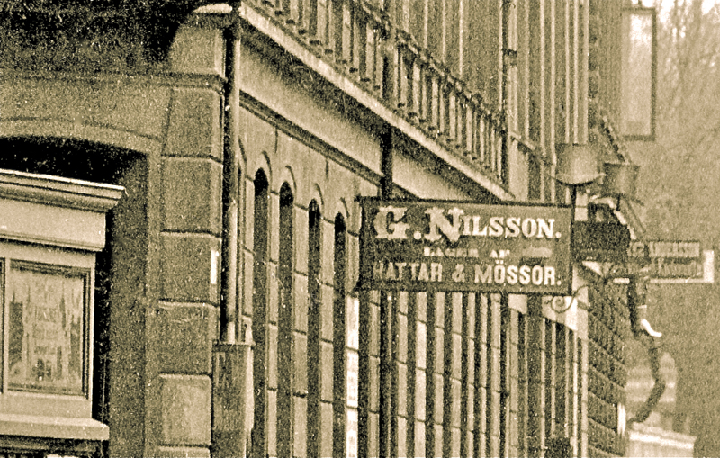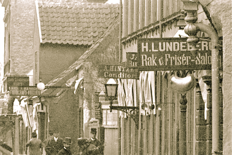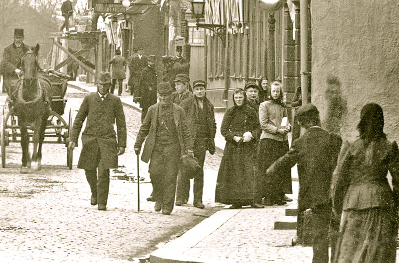 Många detaljer framträder i bildutsnitten. Byggnader, stenläggning, hästskit och reklamskyltar. På ett plank syns fotografen C F Piils skylt över ett elegant skyltskåp med porträttfotografier. Mest fascinerande är givetvis människorna som befolkar gatuscenen. Det finns många mikroberättelser att fångas av.