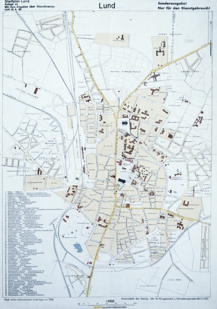 Längst upp står: Stadtplan Lund, Anlage zu Mil,-Geo.-Angaben über Skandinavien vom 12. 4. 40 och Sonderausgabe! Nur für den Dienstgebrauch!