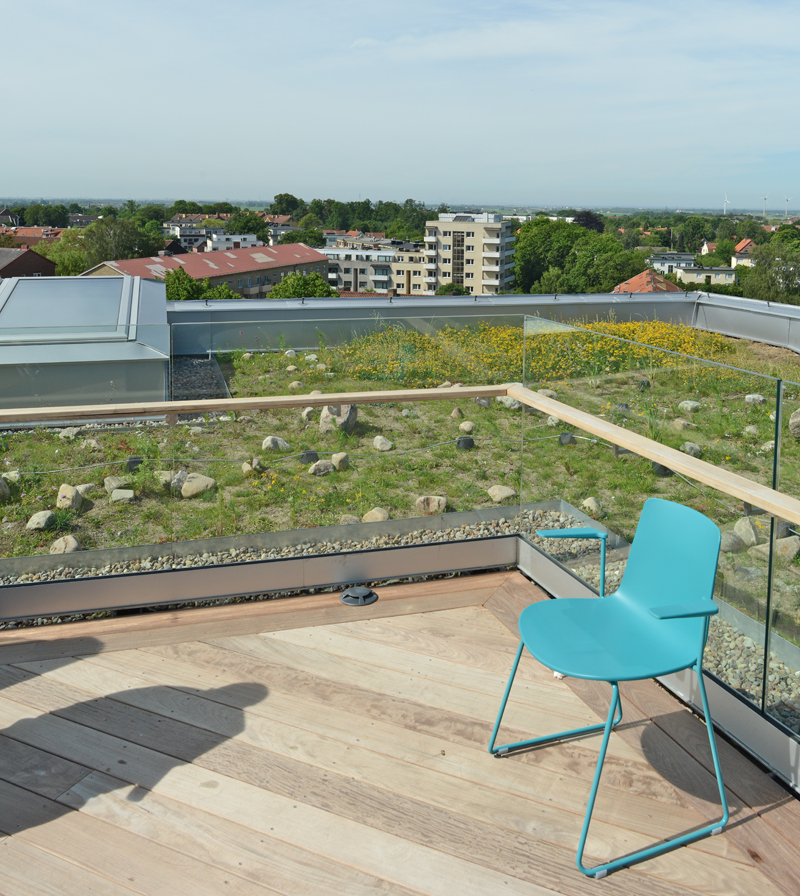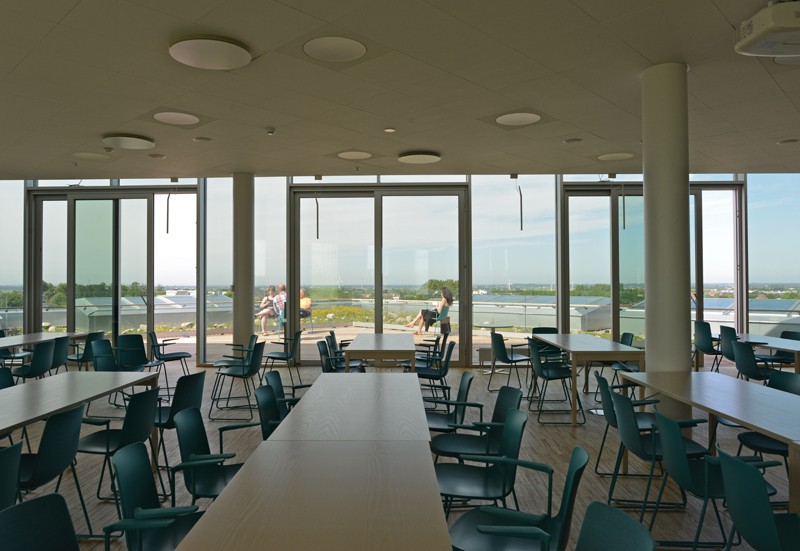 På sjunde våningen i Kristallen finns de anställdas lunchrestaurang med utsikt över stora delar av Lund. Clemenstorget från ovan, spårområdet och siluetten av Danmark kan de anställda njuta när det äter lunch. Varma dagar kan de gå ut på ett soldäck med ängsgräs och blåklockor, allt för miljön skull. Solpaneler finns på taket och 40 borrhål förser huset med geotermi för värme och kyla.