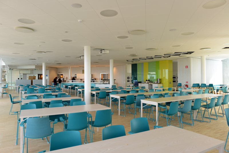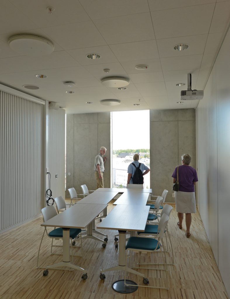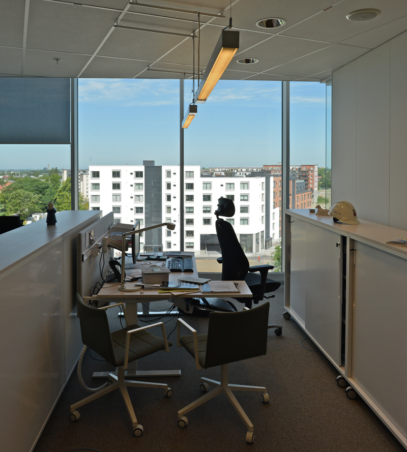 Under våren 2014 har 500 av kommunens anställda fått sina arbetsplatser i det nya huset. Det är det öppna kontorslandskapets idé som gäller. Ingen har eget arbetsrum. Men det är gott om små ”tysta rum” och möteslokaler när det ska pratas enskilt.