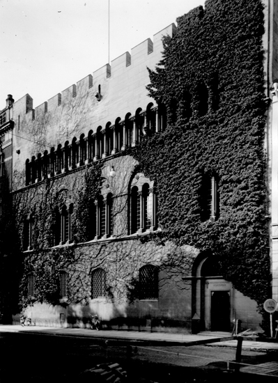 Huvudfasaden mot Kyrkogatan är utförd i grå släthuggen ignabergakalksten och har en sluten, nästan fästningslik karaktär. Bottenvåningen har skarpt utskurna gallerförsedda fönster och rundbågig port. De övre våningarna har smala, höga rundbågiga fönster, grupperade tre och tre och inramade av kolonetter. Den översta våningens fönsterrad ligger indragen bakom ett genomgående kolonettgalleri. Överst avslutas muren med krenelering.