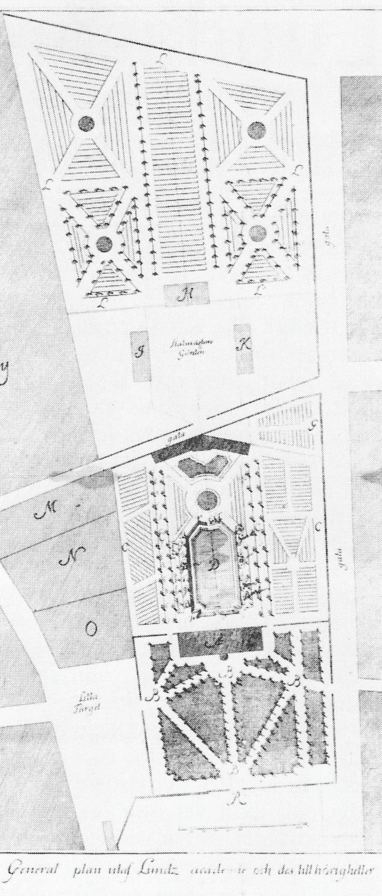 I trädgården anlades en botanisk trädgård med orangeri, spegeldamm och blomsterkvarter, medan gårdsplanen delades in i gräsplaner och raka alléer med olika svenska trädslag. Några år efter det att murarna runt Lundagård färdigställts, fortsattes de också runt trädgårdens tre sidor. Vid den södra, mot Lundagård sattes ett trästaket. De träportar som hade satts upp i ingångarna till Lundagård 1746 byttes redan efter två år mot järngrindar tillverkade i Stockholm av smeden Setterström. Grindarna kröntes överst av kungliga kronor vilka enligt kanslerns föreskrifter skulle beläggas med äkta guld medan grindarna skulle målas med grön oljefärg. Sandstensportalerna togs bort och ersattes med rusticerade pelare som bar upp grindarna.