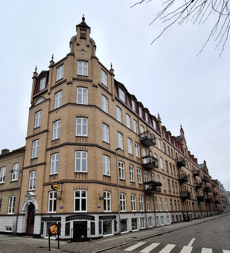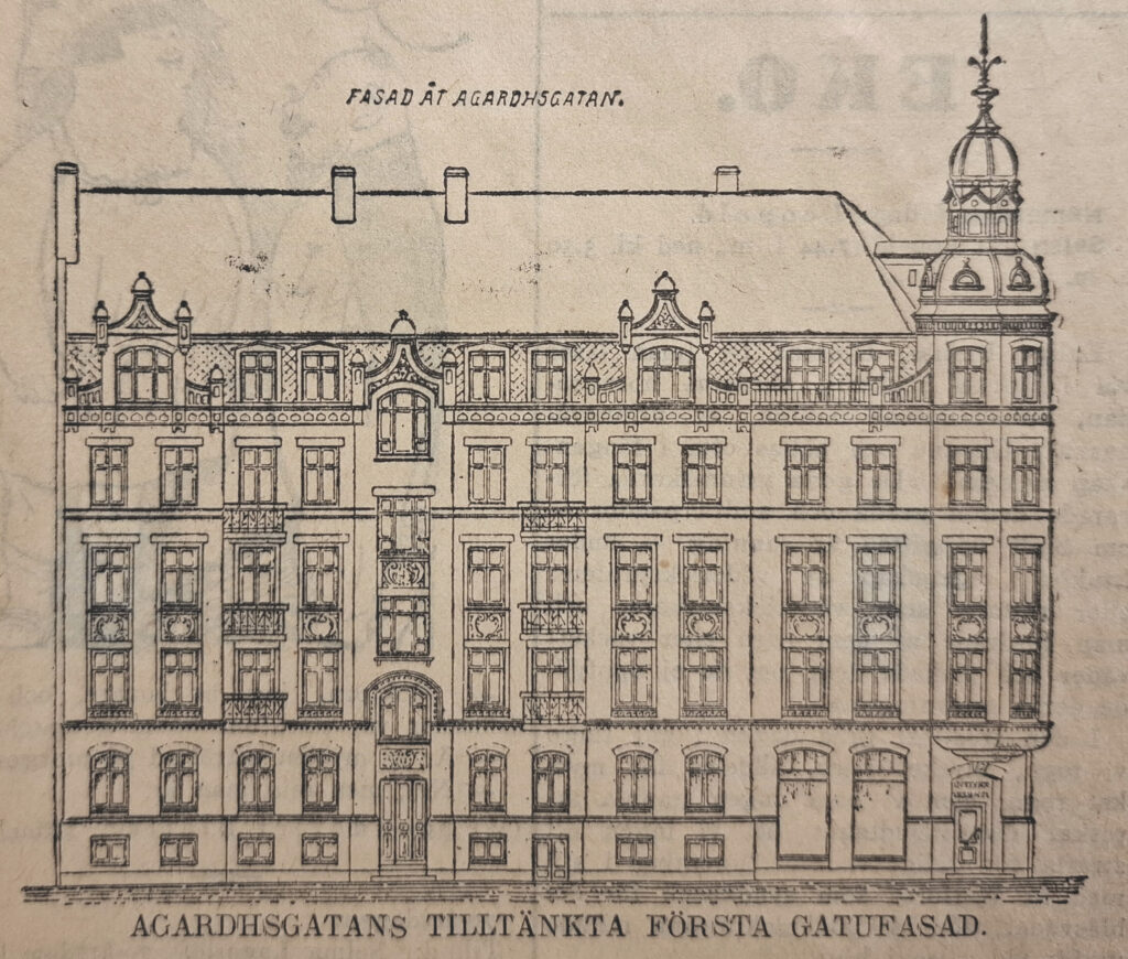 När Agardhsgatan skulle läggas ut över tidigare obebyggda lyckor planerade Wahldén att även där uppföra ett större komplex över två tomter i hörnet av den nya gatan och Östra Vallgatan. Åter gick uppdraget till Sjöström att rita ett hus, eller om det var två, som skulle sträcka sig över de bägge tomterna. Även denna gång valde Sjöström en historiserande stil och fasader i gult förbländetegel. Men jämfört med huset på Skolgatan fick byggnaden en påkostad utformning med en artikulerad gatufasad med kraftigt framspringande sidorisaliter som gav en livfull gatubild. Men när den första delen huset uppfördes 1916 på den ena av de bägge tomterna, måste det ha känts rätt daterat. I början av seklet hade jugenden och sedan nationalromantiken slagit igenom, men av detta märktes föga i Sjöströms hus.