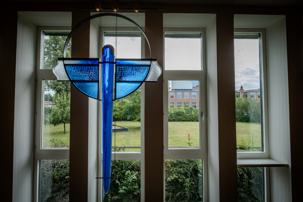 Krucifixet är skapat av glaskonstnären Bertil Vallien. Korset är i blått glas och smidesjärn som bildar ett ringkors. Krucifix ger ytterligare kraft till rummets sakrala prägel. Det nya korset göts på Åfors glasbruk och invigdes på Trettondagen år 1996.