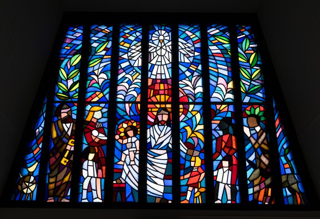 Ovanför dörren i öster som leder ut till kyrkotorget finns Tore Ekelins glasmosaik med temat ”Störst i hela himmelriket” Det är en hyllning till församlingens barn- och ungdomsverksamhet. Tore Ekelin var teckningslärare på Katedralskolan, där han också varit elev och verkade under lång period som allsidig konstnär. Tore Ekelin har sin gravplats på S:t Peters Kloster kyrkogård
