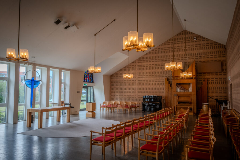 Väggarna är målade i en ljus terrakottakulör med tydliga penseldrag, och golvet är belagt med grå och gråröd hyvlad kalksten. Stolarna vänder sig mot altaret och glaskrucifixet som är placerat mitt framför den östra väggens breda fönsterparti. Kyrkorummet lyses upp av åtta ljuskronor.
