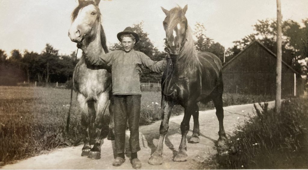 Allan Ljung harvar med sin ardennerhäst Felix i början av 1950-talet. Till vänster syns Fysicum och till höger huset på Gerdagatan 13. Foto: Eva Ljung.