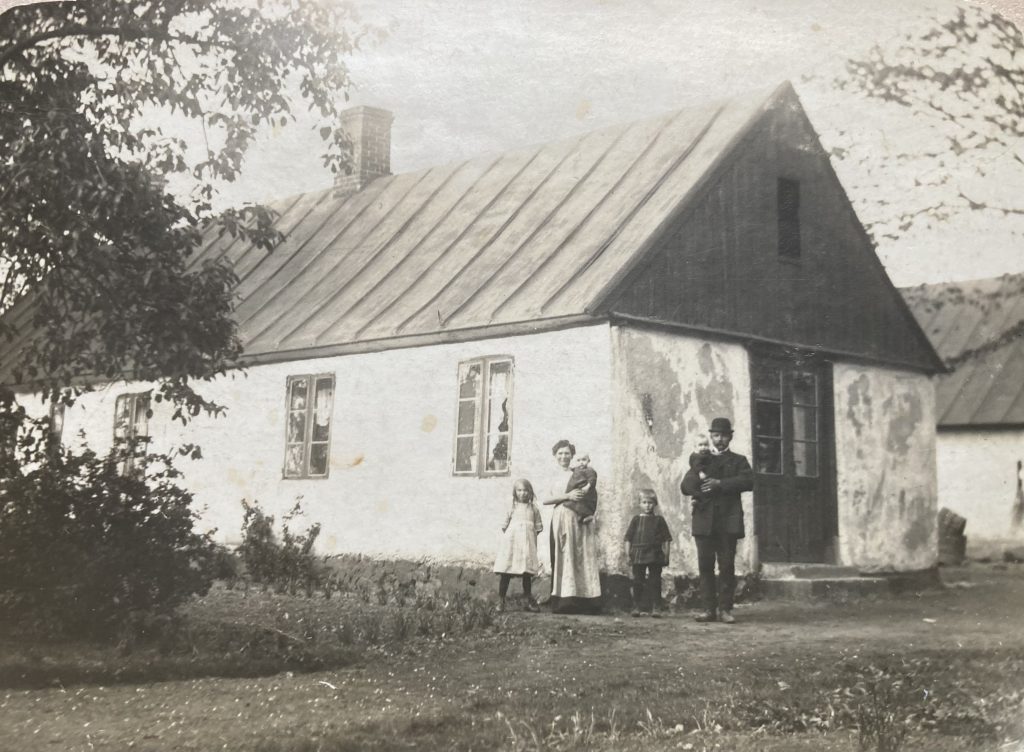 Fridhem 1913. Framför huset står Arrendatorerna Maria och Johan Ljung tillsammans med barnen Elsa och Allan samt i famnen på föräldrarna tvillingarna Ingrid och Edvin. Som ung arbetade Johan som nattvakt på Trollebergs gård där Maria tjänade som piga. Fotot togs av Johans tvillingbror Nils Ljung som också bodde och arbetade på gården.