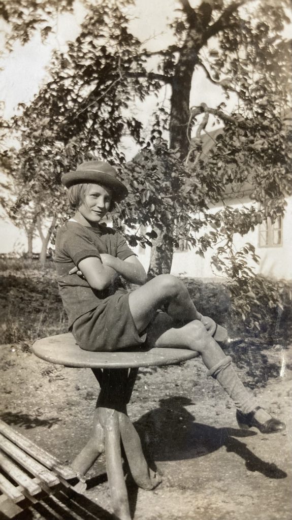 Ingrid fotograferad av sin farbror Nils Ljung. Hon var född 1912 och bilden bör vara från senare delen av 1920-talet. Hon var medlem av Lunds Kvinnliga Gymnastikförening och deltog i truppuppvisningar. Shortsen hon bär på bilden påminner också om den tidens gymnastikkläder.