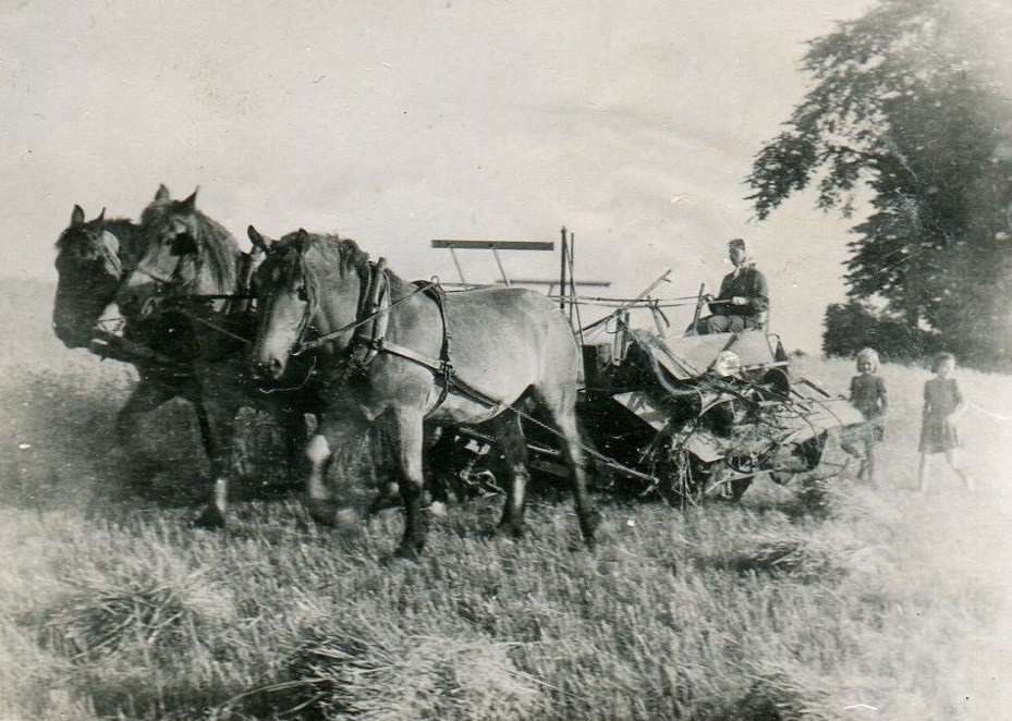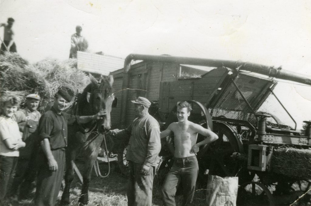 Tröskverket, en föregångare till skördetröskan, drevs av en traktor med drivhjul och långa läderremmar. Släktingar och grannar ställde upp som hjälpredor. Från hölasset lyfts kärvarna över till tröskan med en tjuga, där de matas in. Till höger om hästen Nils Ljung. Foto från 1950-talet.