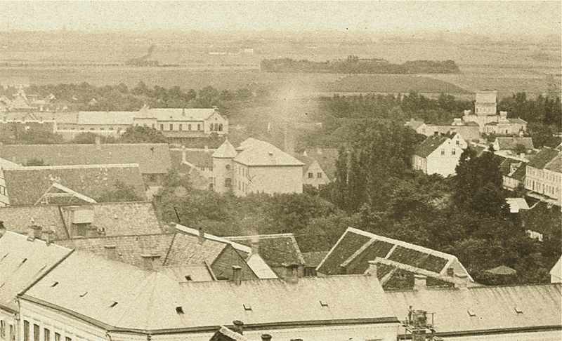 Utanför den gamla vallgränsen breder jordbrukslandskapet ut sig. Vid horisonten skymtar Uppåkra kyrka och nära Malmövägen Höjebromölla. Sankt Lars sjukhus har ännu inte börjat byggas. I träddungen till höger ligger den bondgård som gav namn till våra dagars Klostergården.