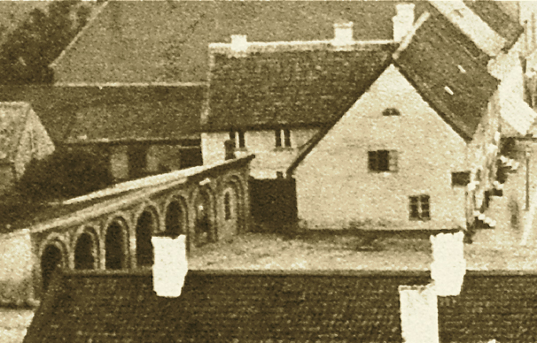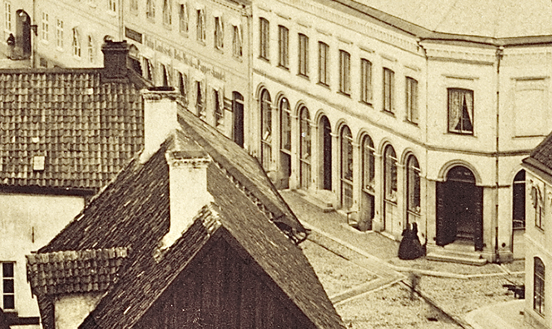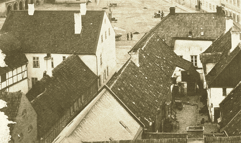 I bildmitten löper Lilla Kyrkogatan. Av bebyggelsen återstår idag bara de tre hus som visar taken nere till höger. I ombyggt skick ingår de i bokhandeln Arken och Domkyrkoforum. Det mesta i de två kvarteren revs 1913 för att lämna plats för bankpalatset som stod klart 1915. Till vänster om Lilla Kyrkogatan reser sig det så kallade Hylénska huset och till höger Lunds rådhus i Brunius version från 1841.