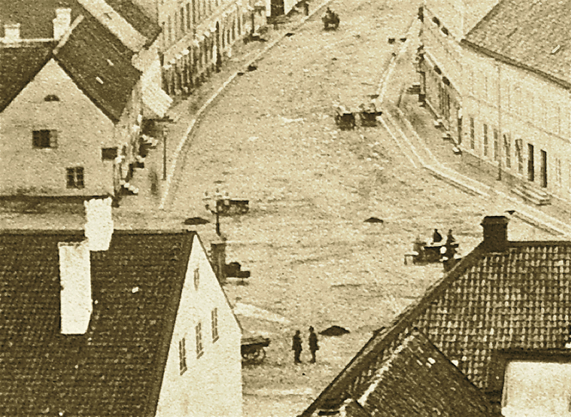 En suddig gatsopare arbetar i mynningen till Clemensgatan (Lilla Fiskaregatan). Värda uppmärksamhet är också de djupa rännstenarna som på flera ställen är brolagda med plankor. Via dessa avlopp dränerades stadsområdet ända fram till 1890 då den första moderna kloakledningen grävdes ner.