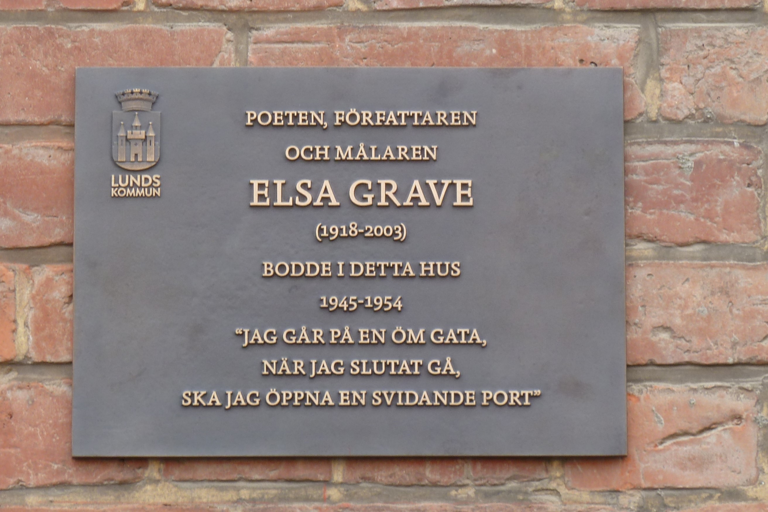 Elsa Grave var författare och konstnär. Hon läste konstvetenskap i Lund, därefter konststudier för Isac Grünewald i Stockholm.Första utställningen på Skånska konstmuseum 1942. Första diktsamlingen, Inkräktare, kom 1943. Hon bildade familj i Lund och bodde många år på Nils Bjelkegatan. Minnestavlan finns vid Nils Bjelkegatan 1. Läs mer om Elsa Grave.