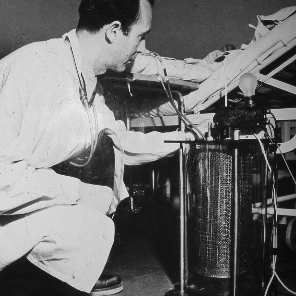 Dialysmaskin/konstgjord njure. Världens första kliniskt användbara konstgjorda njure utvecklas av medicinprofessorn Nils Alwall 1946. Ett möte mellan Holger Crafoord och Alwall blev en förutsättning för uppfinningen. På fotot: Nils Alwall 1946 vid en tidig modell av sin dialysmaskin.